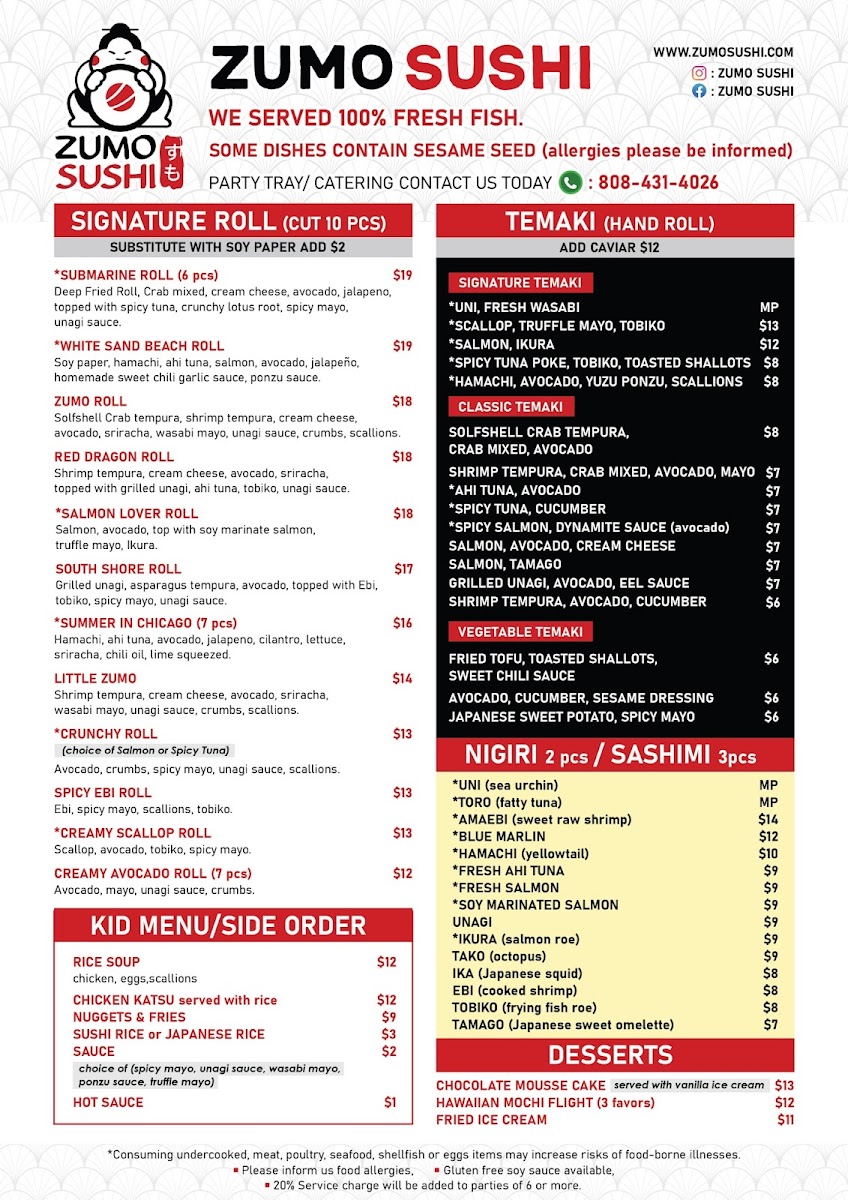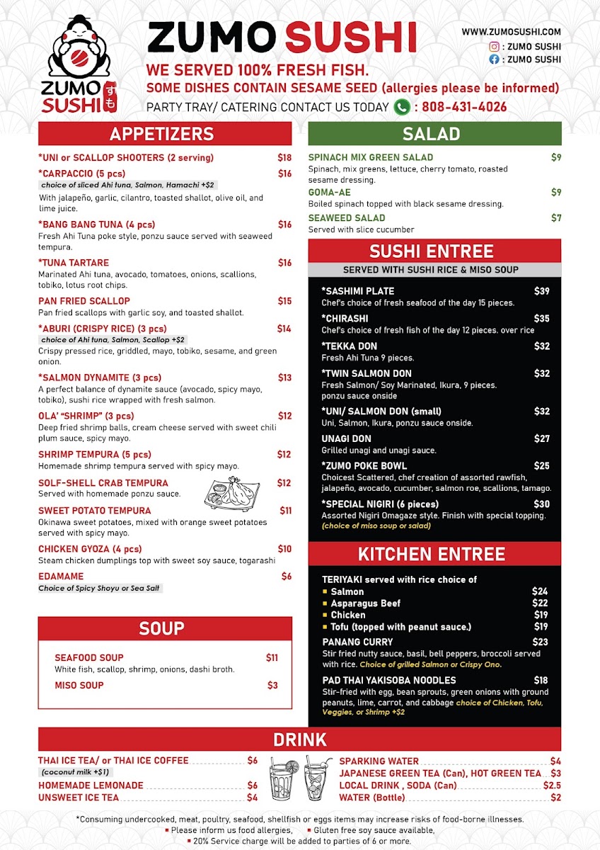 If you're in the mood for a delicious sushi experience, the Zumo Sushi Menu has something to satisfy every craving. Located in the heart of Kauai Village Shopping Center, at 4-831 Kuhio Hwy #156, Kapaʻa, HI, this spot offers a variety of fresh and flavorful dishes that will take your taste buds on a delightful journey. Whether you're craving classic sushi rolls, a savory poke bowl, or something a bit more adventurous, their menu is filled with options for every palate.